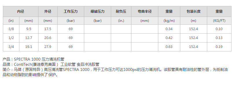 用途:用于工作壓力可達1000psi的壓力清洗機。該膠管具有耐油性的管外層,為抵制油品和動物脂肪的影響提供了保護。