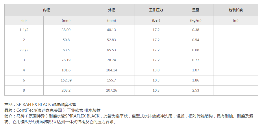 用途:用于加壓熱油回流管路和旋轉式油管。符合SAE J1405高溫傳輸和石油基潤滑系統性能。內膠層:純正的GTS,黑色,耐溫,耐化學腐蝕,特殊化合物(J型CPE)。強化層:2層高強度鋼絲編織。外膠層:藍色,耐油,防霉紡織編織,浸漬合成橡膠。溫度范圍:石油基流體:-40°F~+300°F (-40°C~+149°C)。流體制造商